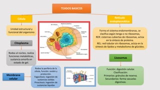 Este documento describe los principales tejidos básicos que componen las células. Explica que la célula es la unidad estructural y funcional del organismo, rodeada por una membrana celular. Dentro de la célula se encuentra el citoplasma, el retículo endoplasmático, los lisosomas, el núcleo, el complejo de Golgi, las mitocondrias y los ribosomas, cada uno con funciones específicas en los procesos metabólicos y de división celular.