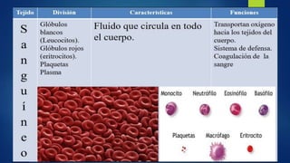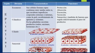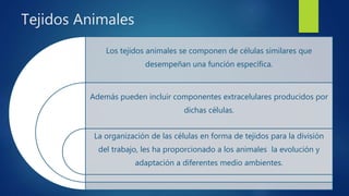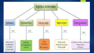 El documento proporciona una introducción a los diferentes tipos de tejidos animales, incluyendo epitelial, conectivo, muscular y nervioso. Explica que los tejidos se componen de células similares agrupadas para llevar a cabo funciones específicas, y que la organización de los tejidos permite la división del trabajo en el cuerpo.