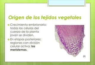 El documento describe los principales tejidos vegetales, incluyendo los tejidos protectores como la epidermis y el súber, los tejidos fundamentales como el parénquima, colénquima y esclerénquima, y los tejidos vasculares como el xilema y el floema. Explica las características y funciones de cada tejido vegetal.