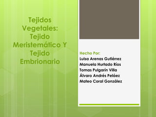 Los tejidos vegetales incluyen el tejido meristemático y el tejido embrionario. El tejido meristemático se compone de células indiferenciadas que se dividen activamente y producen nuevos tejidos a través de la mitosis. El tejido embrionario se forma tempranamente en el desarrollo de la planta y pasa por varias fases para formar los órganos de la semilla.