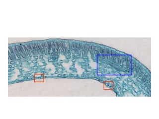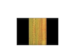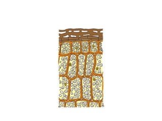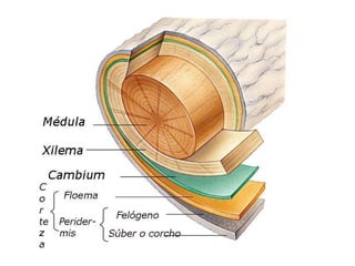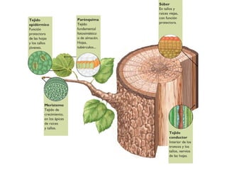 Este documento describe los diferentes tipos de tejidos vegetales, incluyendo meristemos primarios y secundarios, tejidos protectores como la epidermis y el súber, tejidos de sostén como el colénquima y el esclerénquima, tejidos conductores como el floema y el xilema, y estructuras como la peridermis, corteza, cambium y médula. También menciona características como los conductos resiníferos y las cavidades lisígenas.