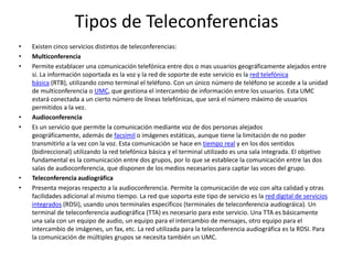 La teleconferencia es una tecnología que permite el intercambio de información a distancia mediante audio, video y transmisión de datos, con diferentes tipos de servicios como multiconferencias, audioconferencias y teleconferencias audiográficas. Cada tipo ofrece distintas capacidades de comunicación, desde voz básica hasta alta calidad de audio y soporte para múltiples grupos. La red y los terminales utilizados varían según el tipo de teleconferencia, proporcionando opciones adecuadas para diferentes necesidades comunicativas.