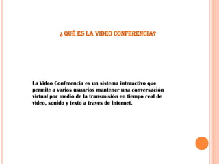 La videoconferencia permite a usuarios mantener conversaciones virtuales en tiempo real a través de video, sonido y texto por Internet. Ofrece beneficios como disminuir distancias y costos, aumentar productividad, maximizar tiempo y fortalecer relaciones. Presenta ventajas como reunir personas en diferentes lugares y compartir información, pero también inconvenientes como gastos y pérdida de tiempo. Existen dos tipos: punto a punto entre dos participantes y multipunto con tres o más participantes a través de una unidad de conferencia multipunto.