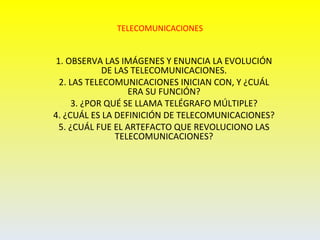 Las telecomunicaciones comenzaron en el siglo XIX con el telégrafo eléctrico, el cual permitía enviar mensajes de letras y números. Más tarde, se desarrolló el telégrafo múltiple que podía enviar varios mensajes por la misma línea y el teletipo que permitía enviar y recibir texto. En los años 1960, las telecomunicaciones comenzaron a usarse en informática con satélites y redes de paquetes. La década de 1970 vio el surgimiento de Internet a partir de ARPANET y la normalización de redes de