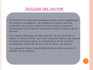 El documento describe los avances rápidos en las telecomunicaciones, incluyendo el desarrollo de la banda ancha, servicios inalámbricos y redes de datos. También analiza cómo estos cambios tecnológicos están transformando la sociedad en una Sociedad de la Información y cómo las empresas pueden desarrollar servicios personalizados para sus clientes en los hogares y empresas.