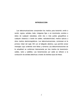 Este documento introduce el concepto de telecomunicaciones, su origen y antecedentes tecnológicos desde el telégrafo eléctrico hasta la actualidad. Explica los contenidos de la disciplina como las ondas electromagnéticas, la transformada de Fourier y las bases teóricas como las matemáticas, la física y la teoría de la información. También describe los conceptos de información, comunicación, lenguaje y los protocolos de comunicación, así como los medios de transmisión como el ancho de banda.