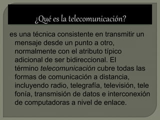 Las telecomunicaciones comenzaron en el siglo XIX con el telégrafo eléctrico y han evolucionado para incluir tecnologías como el teléfono, la radio, el teletipo, los satélites, Internet y las redes inalámbricas. Se define formalmente en 1932 como cualquier transmisión de información a distancia a través de cables, ondas de radio u otros sistemas electromagnéticos. En los últimos años, las telecomunicaciones convergen hacia la interconexión total a través de dispositivos cada vez más avanzados.