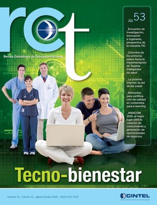 Este documento resume la edición 53 de la Revista Colombiana de Telecomunicaciones. Incluye artículos sobre el IV Encuentro de Investigación, Innovación e Ingeniería que se enfocará en "Tecno-bienestar" y la aplicación de las TIC para generar mayor bienestar. También incluye artículos sobre la implementación de tarjetas inteligentes de salud en Colombia, la "Próxima Internet" basada en redes de objetos, y elementos para la certificación de calidad en contenidos de e-learning. Finalmente, anunc