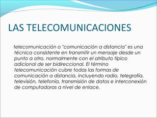 Las telecomunicaciones permiten transmitir mensajes a distancia de forma bidireccional mediante diferentes métodos como la radio, telegrafía, televisión y telefonía. A lo largo de la historia, los humanos han desarrollado diversas técnicas de comunicación a distancia, desde el uso de sonidos y símbolos en la prehistoria, hasta el telégrafo eléctrico en el siglo XIX y la telefonía móvil y videoconferencia en la actualidad.