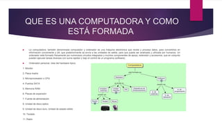 Este documento resume brevemente la historia de las computadoras y las telecomunicaciones. Comienza explicando qué es una computadora y cómo está formada físicamente. Luego describe las primeras generaciones de computadores digitales comerciales y los avances clave como el circuito integrado y el microprocesador. Finalmente, abarca brevemente la historia de Internet y el impacto de los teléfonos inteligentes y las redes sociales.