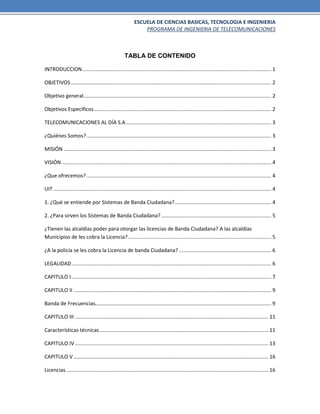 Este documento presenta un resumen de tres oraciones del trabajo final sobre la legislación de telecomunicaciones en Colombia realizado por un grupo de estudiantes de ingeniería de telecomunicaciones. El trabajo describe la creación de una empresa llamada Telecomunicaciones al Día S.A. que ofrece servicios de radiocomunicación de banda ciudadana y detalla los objetivos, servicios, trámites legales y aspectos técnicos de dicha empresa.