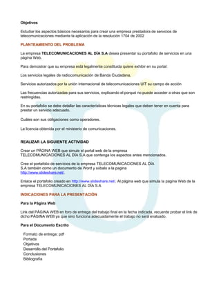 Este documento presenta un proyecto para crear una empresa de telecomunicaciones llamada TELECOMUNICACIONES AL DÍA S.A. que ofrecerá servicios de radiocomunicación de banda ciudadana. El proyecto incluye crear un sitio web y un portafolio de servicios que detallan los servicios autorizados, las frecuencias permitidas, las obligaciones legales de la empresa y la licencia obtenida del Ministerio de Comunicaciones. El objetivo es estudiar los aspectos legales necesarios para crear una empresa de este tipo de acuer