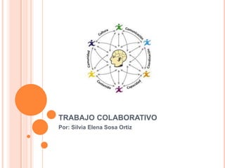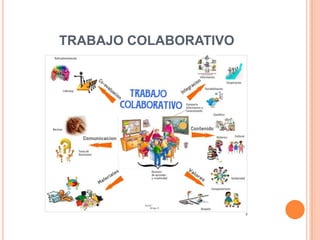 Este documento describe el trabajo colaborativo, incluyendo sus definiciones, importancia, características y el papel del docente. El trabajo colaborativo se define como la construcción de consenso a través de la cooperación entre miembros de un grupo. Aumenta el aprendizaje y desarrolla habilidades sociales y de trabajo en equipo. Requiere responsabilidad individual, interdependencia positiva y habilidades de colaboración. El docente debe incentivar la participación estudiantil y monitorear el proceso colaborativo sin interferir demasiado