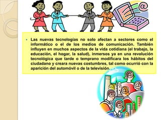 El documento habla sobre la teleeducación y cómo las nuevas tecnologías están influyendo en la educación. La teleeducación utiliza las nuevas tecnologías para desarrollar metodologías alternativas de aprendizaje para estudiantes en poblaciones especiales limitadas por su ubicación, la calidad de la enseñanza o el tiempo disponible. La educación virtual ocurre cuando el profesor y el estudiante están en diferentes lugares al mismo tiempo. El documento enfatiza la importancia de utilizar la tecnología en la educación para brindar nuevas formas
