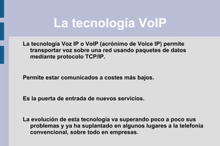 La tecnología VoIP permite realizar llamadas de voz a través de una red de datos usando protocolos TCP/IP a un bajo coste. Es posible diseñar e implementar una red VoIP entre los departamentos de un centro usando teléfonos analógicos, adaptadores analógico-IP y un servidor PBX basado en software libre. La red VoIP propuesta podría conectarse a la red corporativa existente para realizar llamadas externas.
