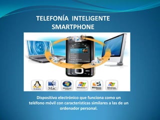 El documento describe un teléfono inteligente (smartphone), que es un dispositivo electrónico que funciona como un teléfono móvil con características similares a las de un ordenador personal, permitiendo la instalación de aplicaciones que incrementan su procesamiento de datos y conectividad. Los principales usuarios de estos teléfonos son ejecutivos móviles que requieren funciones básicas de cómputo y comunicación en cualquier lugar.