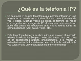 El documento describe diferentes tecnologías relacionadas con la telefonía IP como VoIP, protocolos SIP, H.323 y Megaco. Explica que VoIP permite realizar llamadas a través de Internet utilizando software, mientras que los protocolos como SIP, H.323 y Megaco definen los estándares y procedimientos para establecer y gestionar sesiones de voz y video sobre IP.