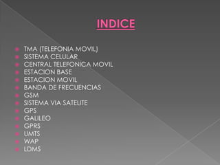 La telefonía móvil permite realizar y recibir llamadas desde equipos portátiles conectados a una red de telefonía celular. Los sistemas celulares dividen el área de cobertura en celdas asignadas a estaciones base que se comunican con los teléfonos móviles dentro de su área. Las estaciones base se conectan a centrales telefónicas móviles que gestionan el tráfico y se conectan a la red fija. Los teléfonos móviles se identifican mediante tarjetas SIM y pueden