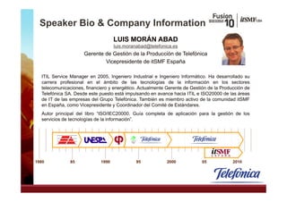 Telefónica ha implementado una estrategia de gestión de servicios de TI (ITSM) alineada con ITIL y ISO 20000, centrada en la mejora continua y estándares globales. La iniciativa comenzó en 2004, con un enfoque en la estandarización de procesos y la alineación de IT con las necesidades del negocio. Las lecciones aprendidas destacan la importancia del modelo de gobernanza IT y la necesidad de adaptabilidad en el contexto de cambios constantes en el entorno empresarial.
