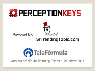El documento presenta un análisis de los temas más comentados en Twitter en México el 24 de enero de 2017. Los principales temas incluyen las protestas contra Donald Trump (#WomensMarch), su toma de posesión (#Inauguration), y homicidios en ciudades mexicanas como Cancún y Monterrey relacionados con el hashtag #Mochilasegura. El documento también incluye datos sobre la duración y palabras clave de los temas más discutidos.