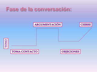 Este documento ofrece consejos sobre cómo mejorar las habilidades de comunicación telefónica para la venta de productos y servicios. Revisa aspectos como la importancia de la voz, la articulación, la elocución y el lenguaje utilizado. También aborda técnicas como la escucha activa, el sondeo, la reformulación, la personalización y cómo realizar un saludo y despedida efectivos. El objetivo es satisfacer las necesidades del cliente de manera clara, ordenada y positiva.