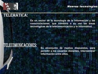La telemática es un campo que integra telecomunicaciones y informática para facilitar el intercambio de información a distancia mediante diversos servicios tecnológicos. Incluye la transmisión de datos, telefonía IP, IPTV, y el uso de tecnologías como el cable coaxial y fibra óptica. La evolución de la comunicación y el constante cambio en la tecnología obligan a los usuarios a adaptarse a nuevas herramientas y plataformas.