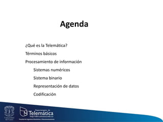 Este documento presenta una introducción a los conceptos básicos de telemática, incluyendo definiciones de términos como datos, comunicación, telemática e informática. Explica que los computadores usan el sistema binario para representar datos y describe los sistemas numéricos binario, octal, decimal y hexadecimal. También cubre temas como la representación y codificación de datos usando bits y bytes.