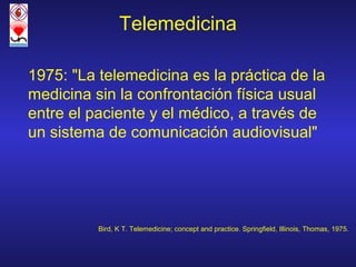 La telemedicina permite el intercambio de información médica entre sitios para mejorar la salud de los pacientes utilizando comunicaciones electrónicas. Requiere telecomunicaciones, ciencia médica computacional y servicios de salud. Ofrece servicios como teleconsultas, telediagnósticos, bases de datos médicas y teleeducación. Se han realizado experiencias exitosas en Argentina y España.