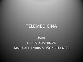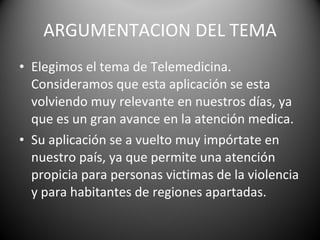 La telemedicina permite que los médicos brinden atención médica a distancia mediante el uso de tecnologías de telecomunicación e informática. Se originó en los Estados Unidos en la década de 1950 y ha evolucionado gracias al desarrollo de internet y las imágenes digitales. Ofrece ventajas como un mejor acceso a la atención médica, especialmente para personas en áreas remotas, y ahorros en los costos de transporte.