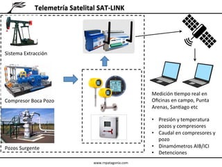 El documento describe los servicios de telemetría satelital SAT-LINK para la medición y monitoreo remoto de pozos de petróleo y gas, compresores, y otros equipos. Ofrece ventajas como baja inversión, monitoreo de múltiples equipos y eventos, alarmas, visualización de datos en línea, y análisis e indicadores para la optimización de producción. Los servicios incluyen instalación de sensores, transmisión vía satélite, software de visualización, y análisis de parámetros e ingeniería