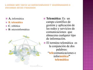El documento trata sobre diferentes temas relacionados con la telemática y la informática. Define telemática como el campo científico de gestión y aplicación de redes y servicios de comunicaciones. Explica conceptos como bits/segundo, simplex/dúplex, sincronía y topología de redes. Finalmente, describe la simulación y la creación de robots a semejanza del hombre.