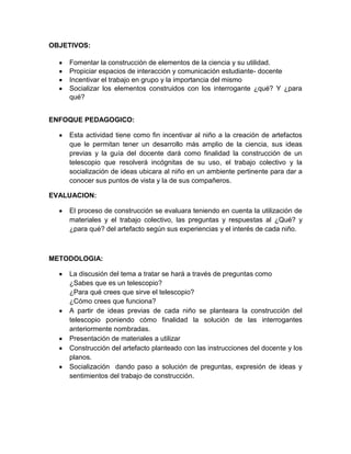 Este documento proporciona instrucciones para construir un telescopio casero con niños en el aula. Se requieren dos lentes convergentes, dos tubos de cartón encajados uno dentro del otro, y cinta adhesiva transparente. El objetivo es fomentar el interés de los niños por la astronomía y las ciencias mediante la construcción práctica de un instrumento y la observación del cielo.
