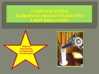 Este documento anuncia un taller de 6 horas para enseñar a construir un telescopio Newtoniano funcional con material reciclable a bajo costo. El taller cubrirá la teoría y práctica de la construcción, incluyendo los materiales necesarios, el mecanismo para apuntar y enfocar el telescopio, y su capacidad para observar planetas, constelaciones y estrellas. El taller será impartido por David Francisco Camargo Hernández, autor e inventor con experiencia en este tema.