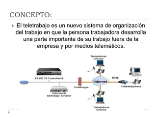 El documento describe el teletrabajo, incluyendo que permite a los trabajadores desarrollar parte de su trabajo fuera de la oficina mediante medios telemáticos. Lista varios campos profesionales como consultoría, programación, marketing y atención médica que se pueden realizar mediante teletrabajo. Explica las ventajas del teletrabajo como horarios flexibles, autonomía y ahorro de tiempo de desplazamiento, además de mencionar diferentes tipos como trabajo desde casa, itinerante u oficinas a