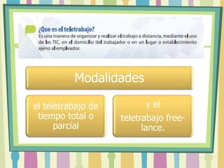 El documento habla sobre diferentes modalidades de teletrabajo como el tiempo total o parcial y el trabajo freelance a distancia.