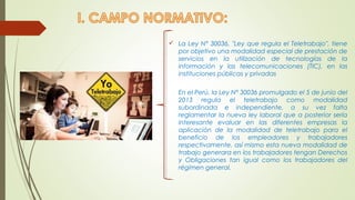 La Ley N° 30036 regula el teletrabajo en Perú y tiene como objetivo establecer el marco normativo para esta modalidad de trabajo que utiliza tecnologías de información y comunicación. El teletrabajo se caracteriza por el desempeño laboral sin presencia física en la empresa a través de medios informáticos y de telecomunicaciones. La Organización Internacional del Trabajo ha publicado estudios sobre teletrabajo y trabajo a domicilio, adoptando en 1998 una resolución sobre teletrabajo en servicios postales y de tele