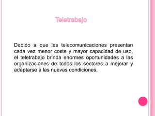 El documento habla sobre el teletrabajo, definiéndolo como actividades que pueden realizarse fuera del lugar de trabajo habitual utilizando tecnologías de la información y comunicación. Explora las tendencias sociales, del individuo y de las empresas que impulsan el teletrabajo, y analiza las ventajas y desventajas para empresas, trabajadores y sociedad. Finalmente, describe diferentes maneras de realizar el teletrabajo y los pasos iniciales para empezar un programa de teletrabajo en una empresa.