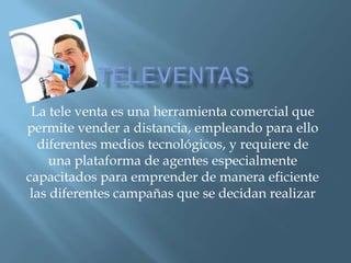 Este documento describe las herramientas de la televentas y las habilidades necesarias para los agentes. Explica que la televentas permite vender a distancia usando medios tecnológicos y requiere una plataforma de agentes capacitados para llevar a cabo campañas de manera efectiva. También destaca la importancia de la voz, la sonrisa y el lenguaje positivo para crear confianza con los clientes y transmitir una buena imagen de la empresa.