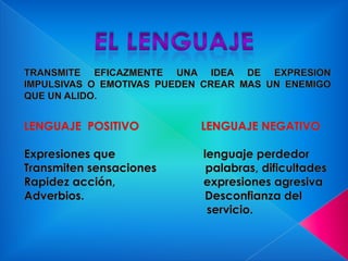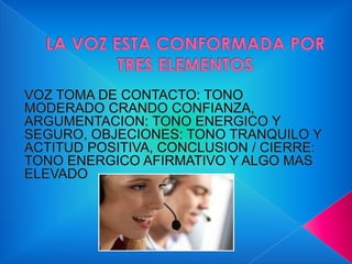 Este documento describe la importancia de la voz en las comunicaciones con clientes y ofrece consejos para mejorar la voz y la comunicación. La voz puede transmitir mensajes positivos o negativos y crear confianza u ofender. Se recomienda vocalizar las palabras claramente, sonreír para transmitir una actitud positiva, y usar el nombre del cliente para conectar emocionalmente.
