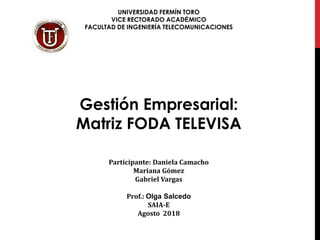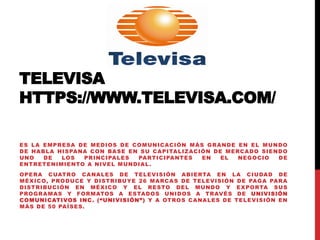 El documento presenta una matriz FODA de la empresa Televisa, la empresa de medios más grande de habla hispana. Identifica fortalezas como su reconocimiento global, portafolio de marcas y alcance internacional. Debilidades incluyen menores ingresos debido a nuevas estrategias publicitarias. Oportunidades son crear una plataforma digital y ser aliados estratégicos de agencias mediáticas. Amenazas son mayor competencia ofreciendo descuentos publicitarios. Propone estrategias de marketing digital y redes sociales para impulsar