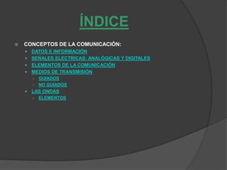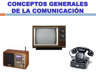 Este documento presenta conceptos generales sobre la comunicación. Explica que los datos pueden ser analógicos o digitales y define las señales analógicas y digitales. Identifica los elementos clave de la comunicación como el emisor, receptor, código, canal y mensaje. Describe los medios de transmisión guiados y no guiados y los tipos de televisión como terrestre, satelital y por cable.