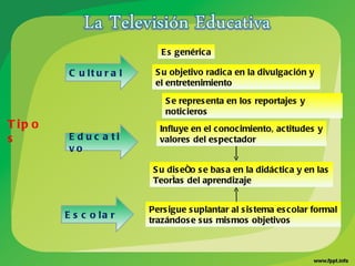 Este documento describe la televisión educativa, sus características y etapas. La televisión educativa tiene como objetivo difundir conocimientos de forma didáctica e influir en las actitudes y valores del espectador. Sus programas se diseñan con contenidos educativos y son producidos por expertos. El proceso incluye etapas de pre-televisión, televisión y evaluación posterior.