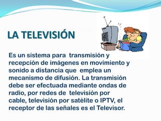 El documento habla sobre la televisión educativa. Explica que la televisión es un sistema para transmitir imágenes y sonido a distancia usando ondas de radio, cable, satélite o IPTV. Luego describe tres tipos de televisión educativa - cultural, educativa y escolar - distinguiéndolas por sus contenidos, objetivos y destinatarios. Finalmente, enumera algunas funciones de la televisión educativa como facilitar recursos para profesores, apoyar el sistema educativo y mejorar la calidad de la información que se ofrece.