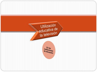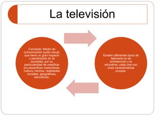 El documento describe los diferentes tipos de televisión, incluyendo la televisión educativa, la cual tiene como objetivos servir de apoyo al docente y sustituir la formación escolar presencial. Existen etapas de la televisión educativa como la preteledifusión y la teledifusión. Los tipos principales son la televisión cultural, educativa y escolar. La televisión interactiva permite la comunicación entre personas distantes interesadas en un tema, corrigiendo las falencias de la televisión tradicional.
