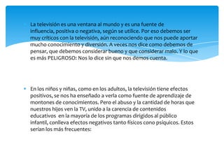El documento discute los efectos positivos y negativos de la televisión en los niños. Señala que aunque la televisión puede ser una fuente de aprendizaje, el exceso de horas que los niños pasan viendo la televisión y la falta de contenido educativo en muchos programas infantiles puede tener efectos físicos y psicológicos negativos. También enfatiza la importancia de que los padres supervisen el contenido que ven sus hijos y comenten los programas con ellos.