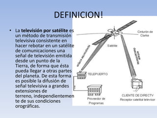 La televisión por satélite permite transmitir señales de televisión desde un satélite geoestacionario a grandes áreas de la Tierra. La señal es emitida a un satélite y luego retransmitida a usuarios finales que cuentan con antenas parabólicas receptoras. Existen diferentes estándares como DVB-S y DVB-S2 para la transmisión digital por satélite. El futuro de la televisión satelital promete avances como acceso interactivo de video bajo demanda desde cualquier lugar dentro de la cobertura.