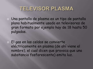 Este documento resume las principales características de diferentes tipos de televisores, incluyendo pantallas de plasma, LCD, LED y 3D. Las pantallas de plasma se usan comúnmente en televisores grandes de 18 a 50 pulgadas. Los televisores LCD producen colores más brillantes que las pantallas de plasma y los televisores LED consumen menos energía, ofrecen mejor contraste y ocupan menos espacio. La tecnología 3D permite ver imágenes en tres dimensiones usando lentes especiales.