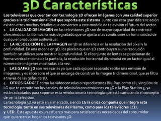Este documento describe las características de las televisiones 3D y LED. Las televisiones 3D ofrecen imágenes tridimensionales de alta calidad gracias a la tecnología 3D. Las televisiones LED iluminan la pantalla de forma directa e inteligente para mejorar el contraste y la calidad de imagen. Ambos tipos de televisores ofrecen una experiencia de visualización superior e inmersiva.