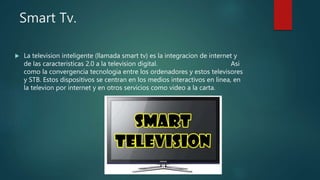 La televisión inteligente, también conocida como smart TV, integra Internet y características interactivas a la televisión digital, permitiendo el acceso a contenido en línea, televisión por Internet y video bajo demanda. Los sistemas operativos más comunes para smart TV son versiones adaptadas de Android u otras plataformas de código abierto, que se actualizan a través de la conexión a Internet.
