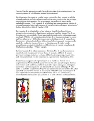 Este documento presenta una introducción a la Cábala y su relación con el Tarot. Explica que la Cábala es una antigua tradición judía de enseñanzas esotéricas que se remonta posiblemente al profeta Moisés. A lo largo de los siglos, la Cábala ha influido en otras tradiciones como el cristianismo y la masonería. También señala las similitudes entre los principios de la Cábala como el Árbol de la Vida y los 22 Arcanos Mayores del Tarot